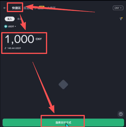 在快捷去我们入金既方便又快捷,我们可以直接输入想要购买的金额,比如说我想买1000人民币的USDT,它就给我们换算出来我大概可以收到140.44个U,点击【选择支付方式】。