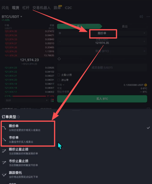 什么是限价单呢?我们可以看到左侧其实是一个买卖的盘口,红色的是卖单,绿色的是买单。如果我使用限价单就可以自己去设定价格,比如说现在比特币的价格是121970,我希望等这个价格跌到121000的时候我再买入,我就可以把这个价格输入进来,然后拉动我们的滑杆,我这里把他拉满,点击【买入BTC】。