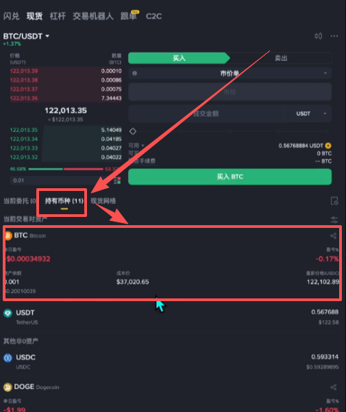 一旦买入它就会立刻成交,在“持有币种”这里我们就可以看到,我现在已经持有了这个比特币了。所以市价单就是极速立刻买卖。