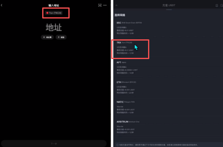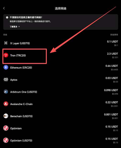 接下来还是选择网络,注意TRX和TRON-TRC20这两个是一条链,都是同一个东西。我们欧易这里选择了TRON-TRC20这条链,币安这里就不能选择BSC、APT这些去提币,是万万不能的。因为我们在充提币的时候,选择网络必须要是一一对应的,否则这个币就会转丢了。