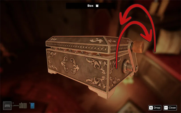将钥匙插入盒子的右侧,当你在某个位置转动发条钥匙时,盖子会停止打开,如果继续转动,盖子会抖动并关闭。转动发条钥匙直到盖子开始发抖动,然后换方向继续打开。