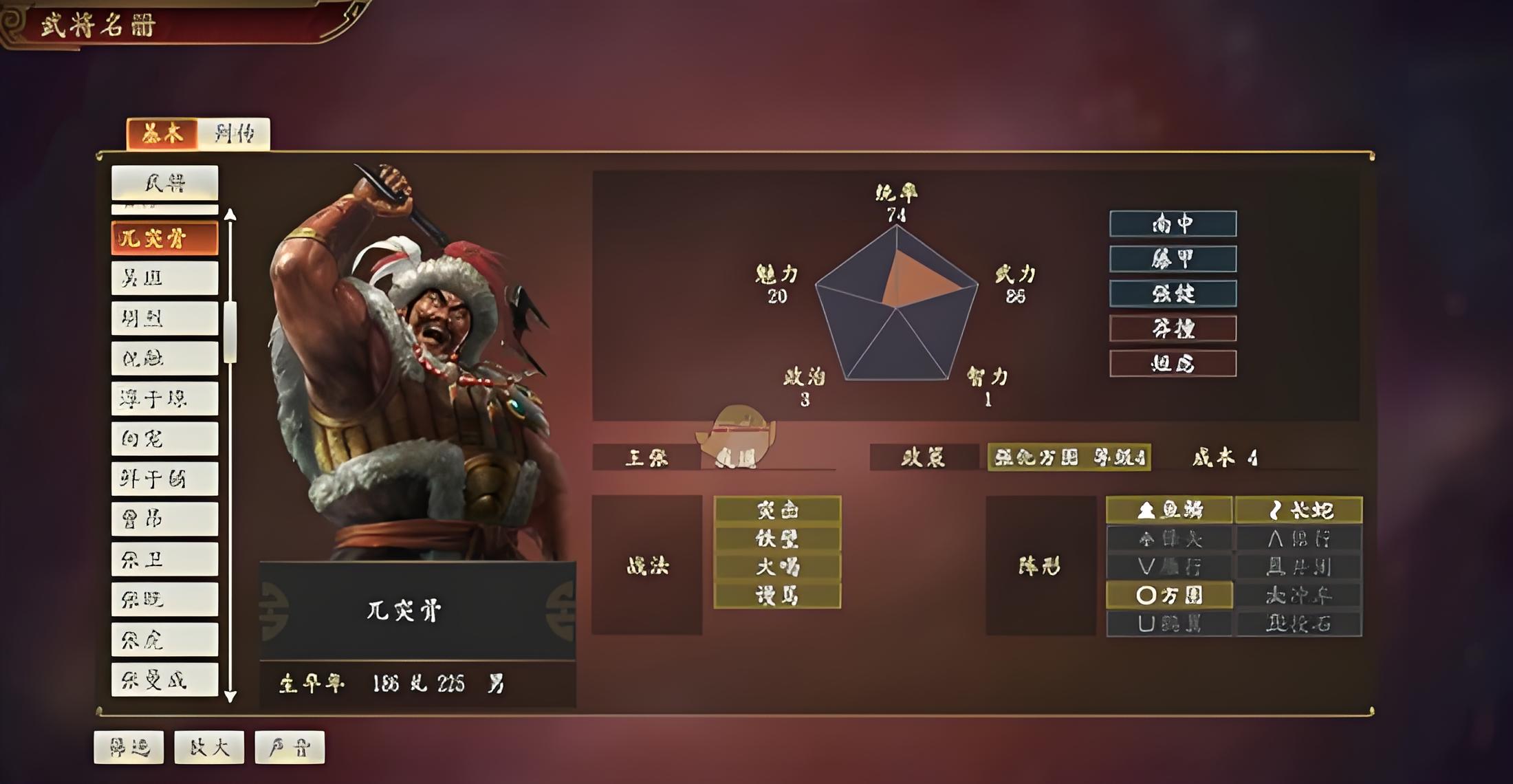 1、核心属性定位清晰,基础兵力达八千统率成长突出,忠诚度八十八稳定性强,盾兵藤甲兵均为S级适性,物理减伤显著适配前排抗伤。