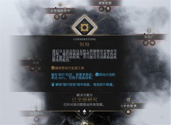 奴役市民,被奴役的降低需求,一千个奴隶需要配十个警卫队,被奴役的市民干活效率高,可以连续加班但是会死人,个人不是很喜欢这个,感觉不如机器人干活,这代机器人又没有一代的百分之六十效率和人一样。反正都是死一些感觉不如点一下效率翻倍有效果。