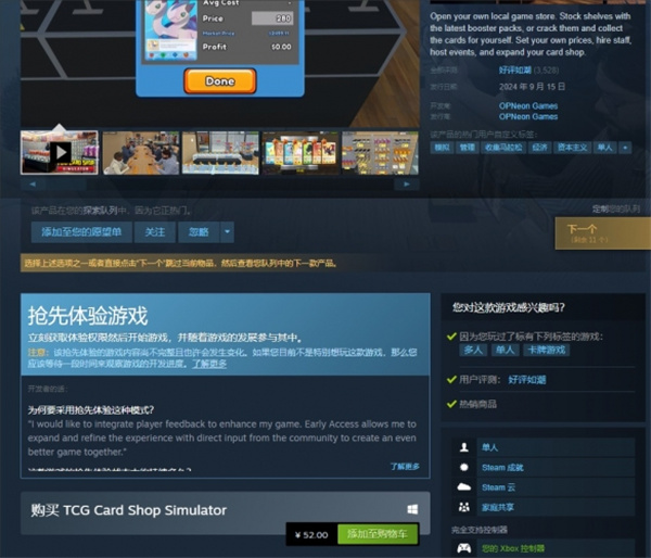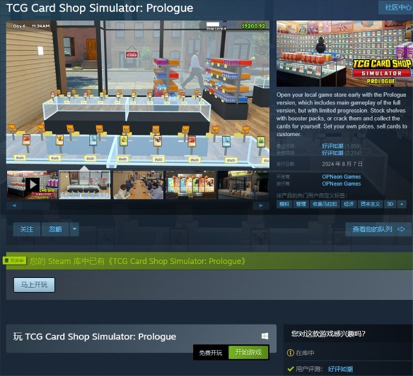 1、TCG卡牌商店模拟器目前steam上有两个版本,一个是免费版的TCG卡牌商店模拟器序章,另一个是TCG卡牌商店模拟器完整版游戏。
