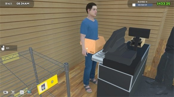 前期没必要追求扩建,额外买2-3个货架,到10级雇50一天的员工,让他收银,自己手动补货即可