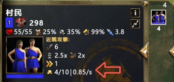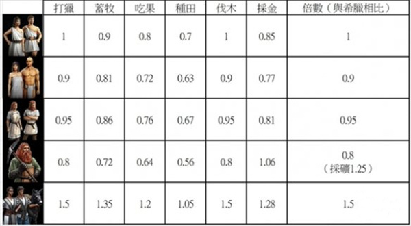希腊村民在打猎效率是每秒1单位,木材和黄金的采集方面表现较为中规中矩,既无显著优势也无明显不足。