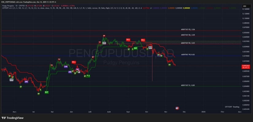 随着价格接连跌破支撑位,PENGU持续下探至0.0123美元附近,创数月新低。EDK发布的图表显示多次回测失败与持续卖出信号,表明空头牢牢掌控局面,每次反弹尝试都遭遇加速抛压。