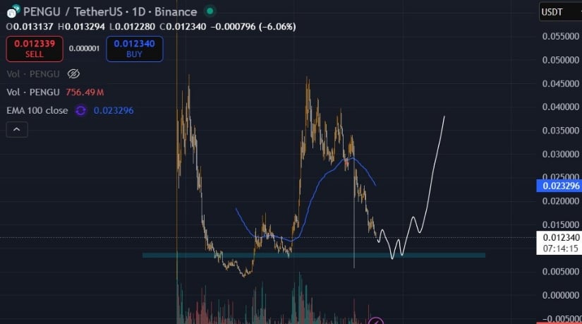 若能守住,根据历史波动区间,反弹至0.017-0.023美元仍具可行性。PENGU在该区域附近数根K线将决定短期方向。