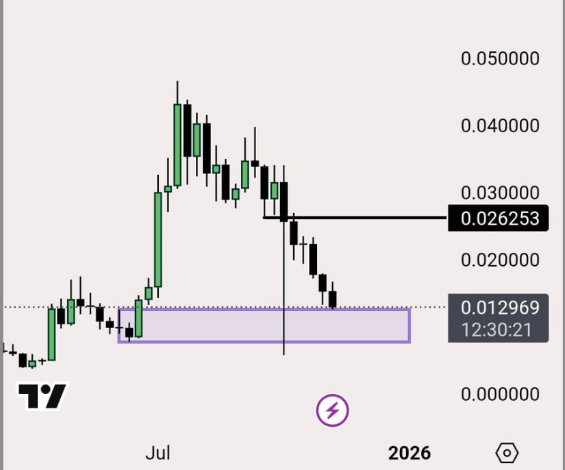 Ali Martinez将0.012美元划为关键防线,图表清晰显示这是阻止价格滑向多月新低的最后结构支撑。目前价格虽勉强悬于该位上方,但若买盘不及时响应,反复测试将增加破位风险。