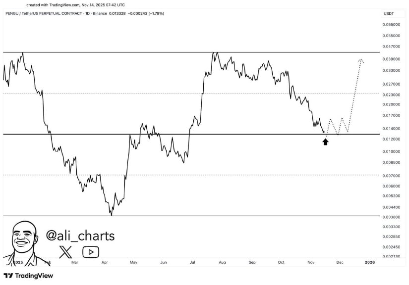 0.012美元是PENGU最后重大支撑,反复测试警示破位风险。来源:Ali Martinez via X