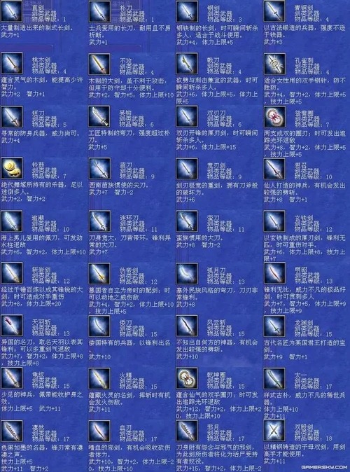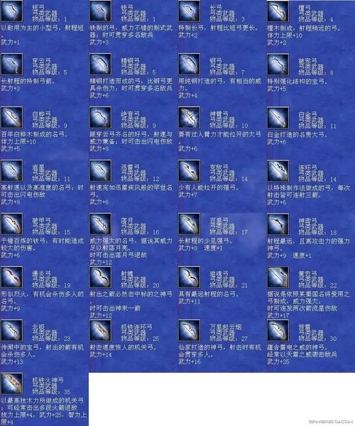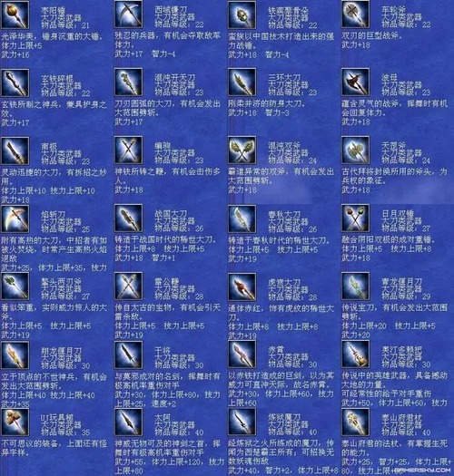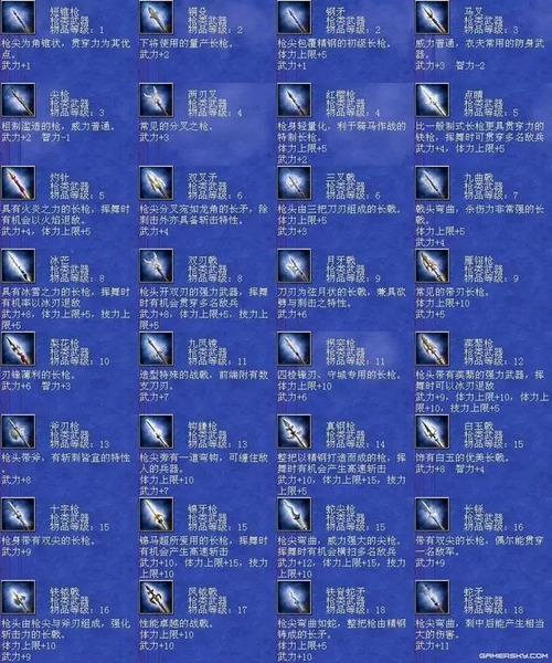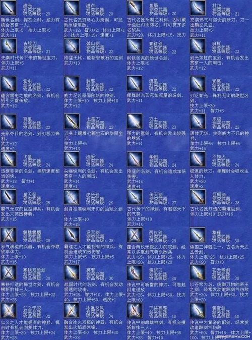 每个武器都具有独特的性质和功效。例如,紫电可以增加攻击力和射程,贲育则可以增加闪避和格挡率。霸王枪可以增加攻击力和暴击率,丈八蛇矛则可以增加攻击范围和穿透力。方天画戟可以增加攻击力和攻击距离,青龙偃月刀可以增加攻击力和暴击率,金龙连弩可以增加攻击速度和射程,雌雄双股剑可以增加攻击力和格挡率,凤凰羽扇则可以增加攻击力和攻击距离。青虹剑是一把全能的武器,可以同时增加攻击力、防御力和移动速度等属性。