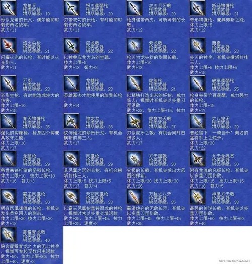 163 霸王凤凰枪 枪 等级 30 武力+18 体力+25 技力+20 忠诚+13 水龙狂涛 神鬼乱舞 五岳华斩 八卦突斩 七星续命灯 冲阵尽灭 封武将技飞马 贯穿四人164 凤凰枪 枪 等级 29 武力+17 智力+4 体力+5 技力+5 忠诚+11 水龙狂涛 神鬼乱舞 五岳华斩 八卦突斩 冲阵破坏 封武将技 横斩前排三人