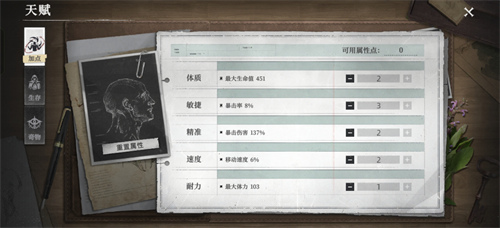 生存类谨慎选择(不能重置),想主玩PVP就主点攻击&生命,佛系玩家主点采矿&伐木(每日搞搞制作,跑跑图即可),对于野外探索感兴趣的主点饥饿&干渴&狩猎
