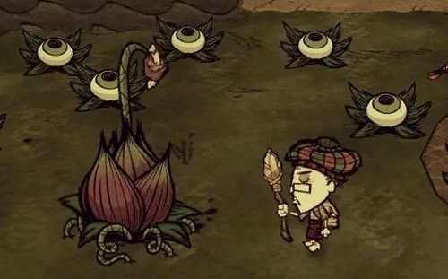 4.食人花球茎本身没有战斗能力,依靠周围的眼球草来捕食。可以用火把引燃食人花,这会导致所有眼球草死亡。食人花在燃烧30秒后会变成灰烬,不会返还吞噬的物品。如果在燃尽之前击杀食人花,会正常掉落吞噬的物品。