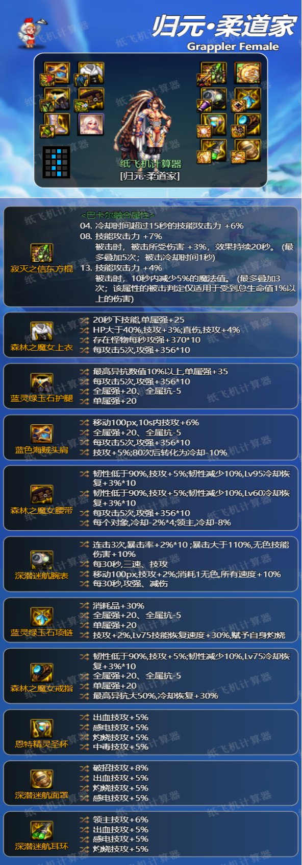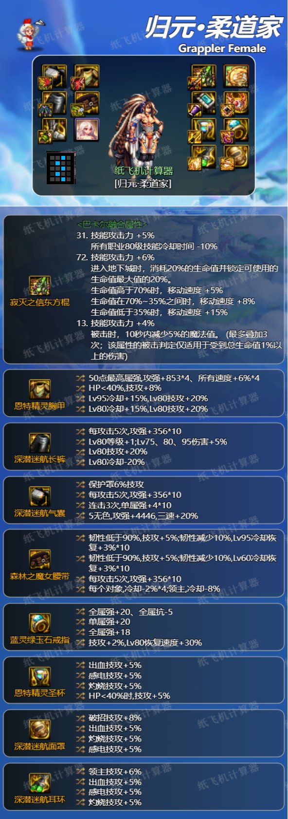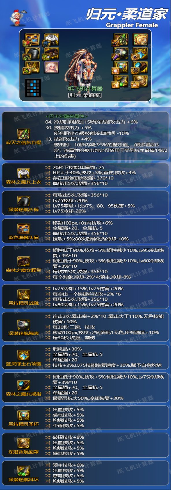如果出了恩特鞋子和深浅裤子可以走这套。女柔道的75级技能的数据中规中矩,走75特化,比不上神剑流,但是也不会比普通的流派弱,主要是特化的装备强度较高。有合适的自定义可以这么走。