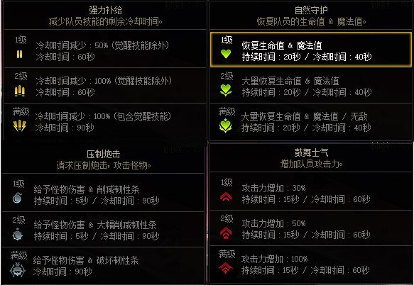 作战过程中,队长可以使用4种增援技能,可直接点击也可使用快捷键,不同技能冷却时间不同,可同时使用多种技能。