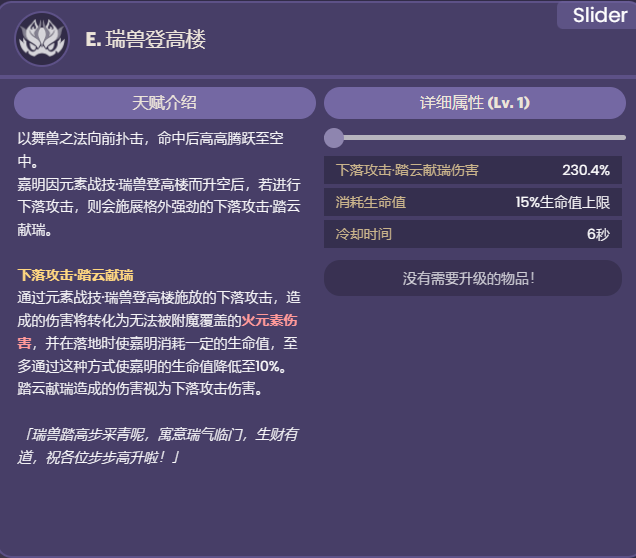 瑞兽登高楼的下落攻击·踏云献瑞命中敌人时,将为嘉明恢复2点元素能量。该效果每0.2秒至多触发一次。