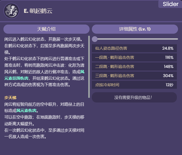 在一次朝起鹤云的鹤云幻化期间施展了1/2/3次步天梯后,该次鹤云幻化期间的闲云冲击波命中敌人时,将为队伍中附近的所有角色恢复生命值,回复量相当于闲云攻击力的50%/80%/150%。该效果每5秒至多触发一次。