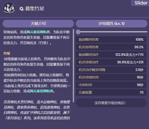 此外,固有天赋「细想应是洞中仙」的效果获得提升:暮集竹星的竹星拥有仙力助推时,附近的当前场上角色的下落攻击坠地冲击造成的伤害提升,提升值相当于闲云的攻击力的306%。通过这种方式,至多使附近的当前场上角色的下落攻击坠地冲击伤害提升15300。