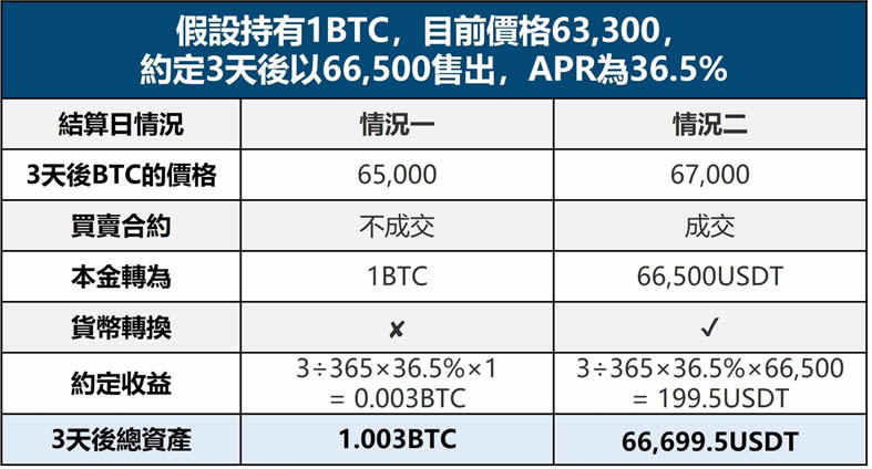 假设投资1BTC,目标价66,500USDT,APR36.5%,3天期: