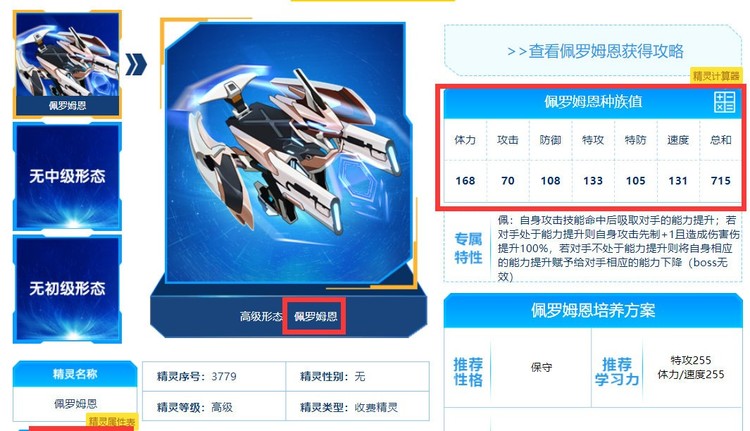 3、次之推荐玩家应用【佩罗姆恩】打圣灵谱尼,其拥有机械属性,同样可以克制圣灵谱尼,打出更多损害,同时自已的种族值达到715,体力、特攻值和速率值都是非常高的。