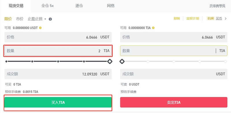 4.在现货交易区搜索TIA/USDT交易对,输入购买数量完成交易