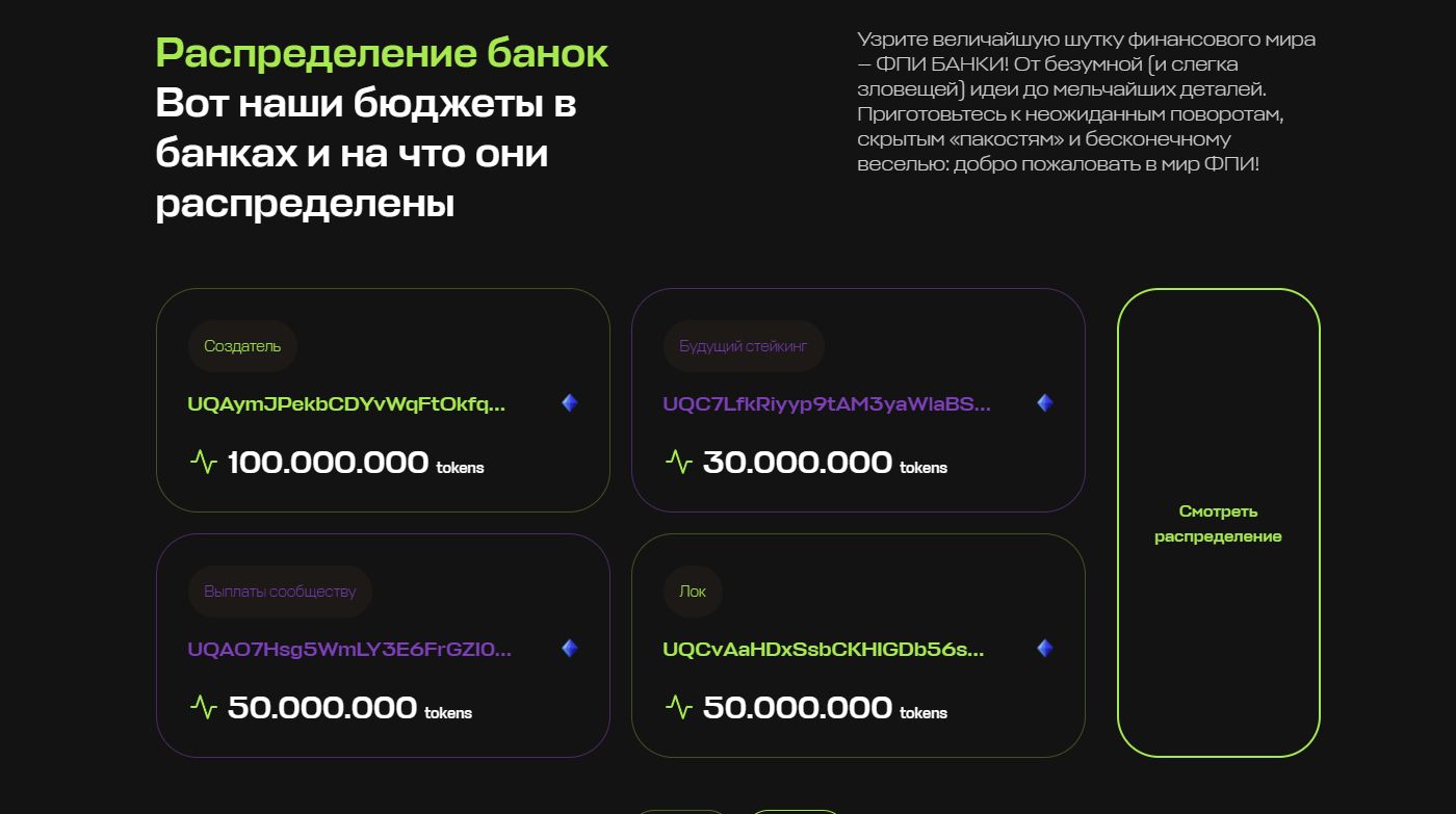 FPIBANK由博主Nowkie创建,灵感来源于对传统金融机构的幽默模仿。其代币分配方案如下: