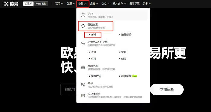 4.登录后返回首页,依次点击交易-基础交易-币币进入交易界面