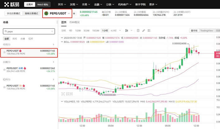 目前PEPE币已在18家交易所上线,以下以欧易OKX为例展示具体操作步骤: