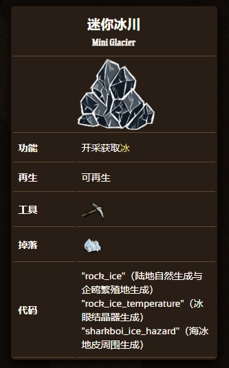 迷你冰川是游戏中一种自然生成物。开采迷你冰川是获取冰最主要的手段。