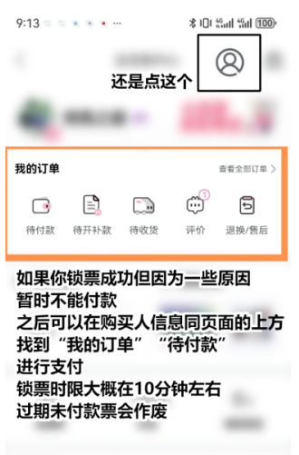 若锁票后需延迟支付,可在"我的订单-待付款"中操作,注意10分钟支付时限