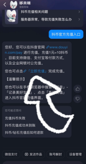 5、在对话框输入"抖音官方充值入口"关键词,按指引完成充值流程