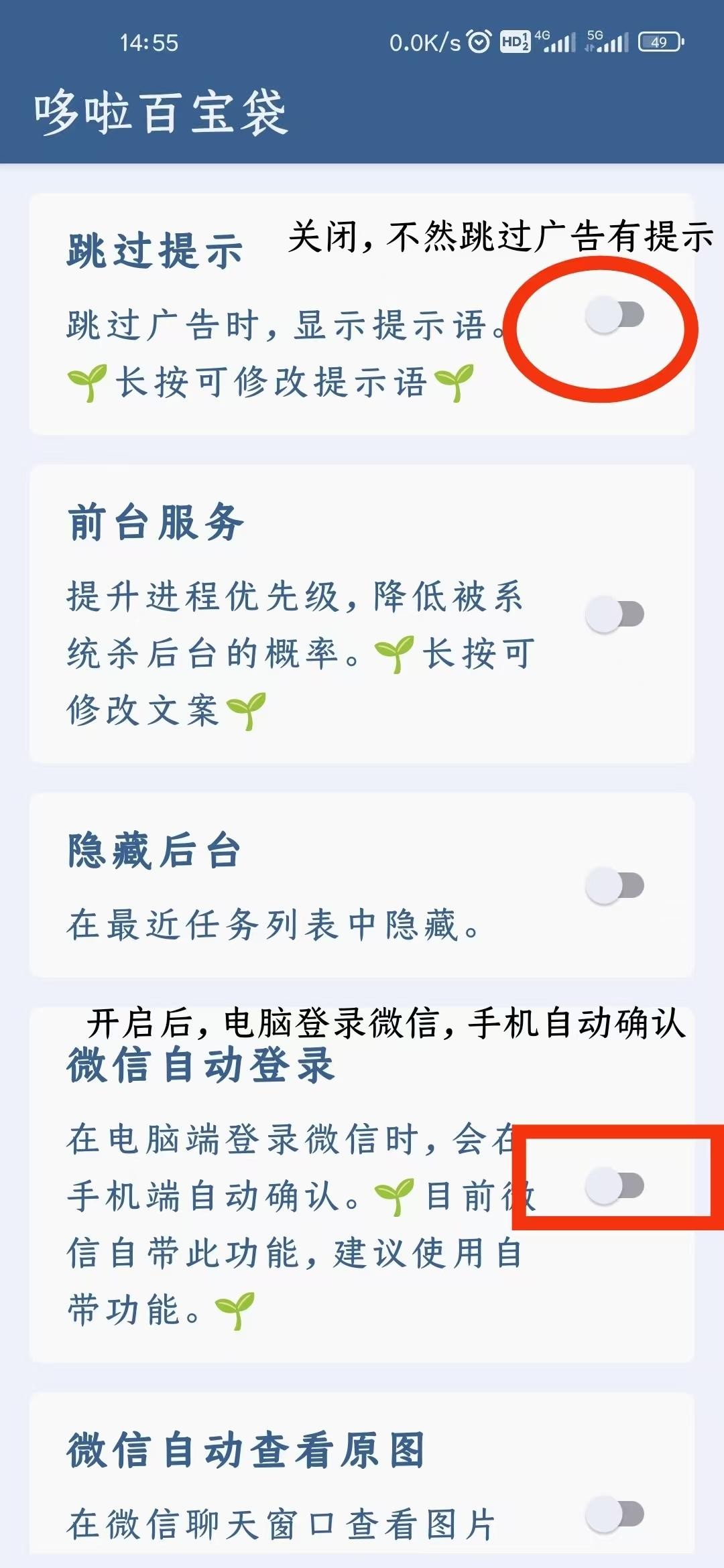 在应用设置中可开启微信自动登录确认等辅助功能: