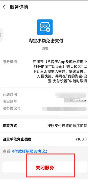 最终在功能详情页点击关闭服务按钮,即可成功解除小额免密支付授权。