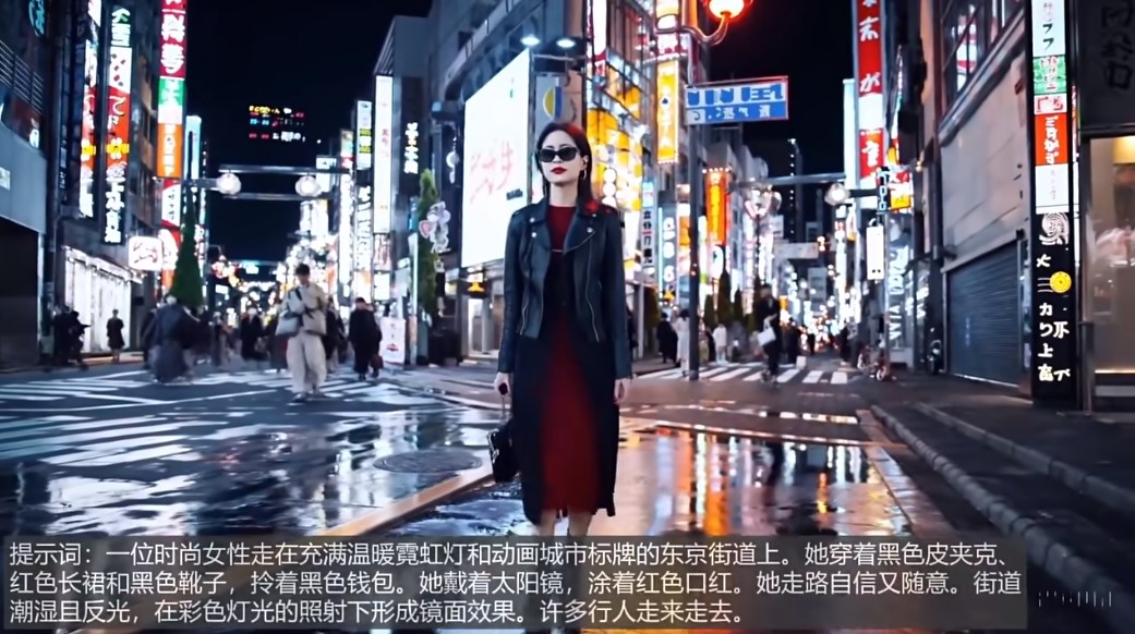 创作示例:身着黑色皮衣与红裙的摩登女性漫步东京街头,霓虹灯光在湿润路面上折射出动态城市光影效果,周围行人穿梭其间。