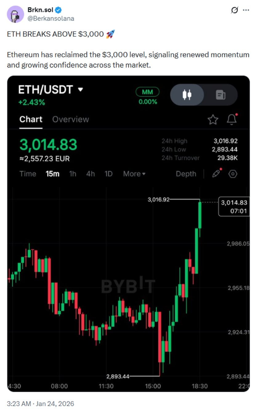以太坊突破3000美元关口,反映短期动能改善与市场信心增强。来源:@Berkansolana via X