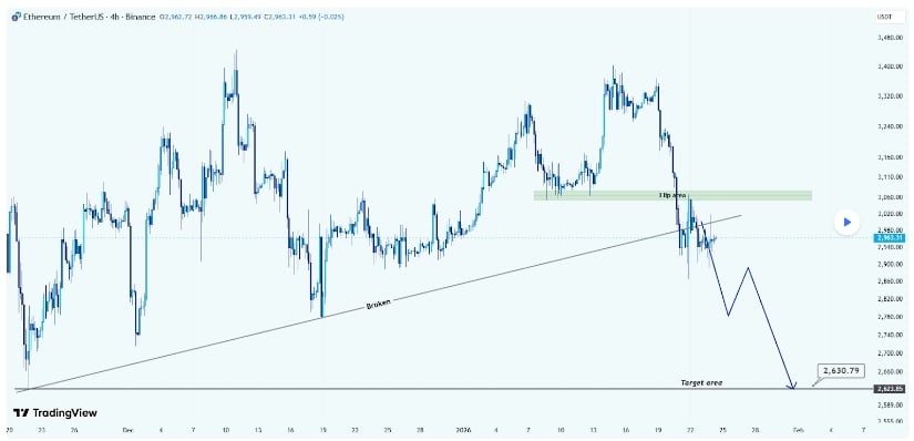 ETH跌破上升趋势线预示短期结构转变,后续回撤确认阻力而非看涨复苏。来源:tradingView上的melikatrader94