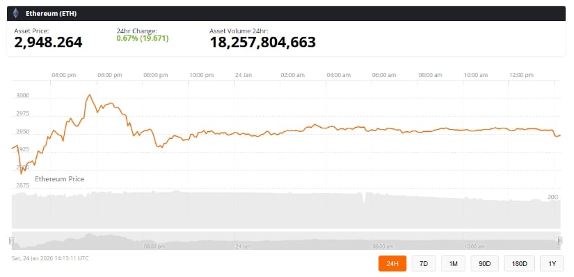 以太坊现报2948.264美元,24小时涨幅0.67%。来源:Brave New Coin