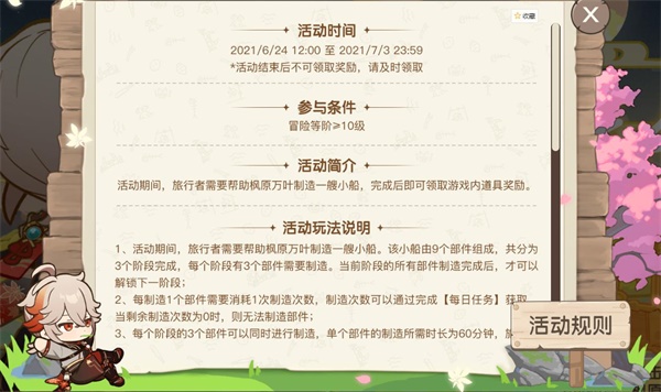 1、活动期间,旅行者需要帮助枫原万叶制造一艘小船。该小船由9个部件组成,共分为3个阶段完成,每个阶段有3个部件需要制造。当前阶段的所有部件制造完成后,解锁下一阶段;