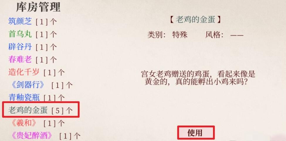 深宫曲游戏中老鸡的金蛋自己吃了没事,还会增加某些属性,但是如果作为礼物送给别的妃子,那么不仅可以涨对方的好感度,还能减少对方的某一项属性!