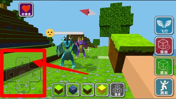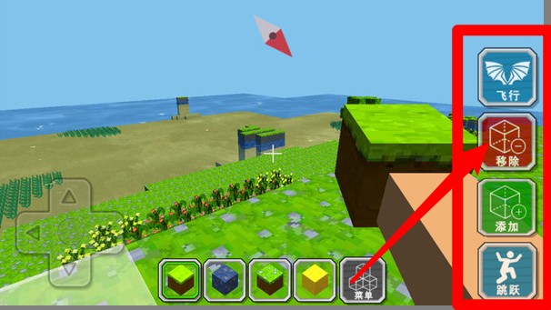 3.右侧功能键:飞行、点击即可进入飞行模式,移除、点击方块可将其删除,添加、方块放置于目标位置,跳跃、进行跳跃。