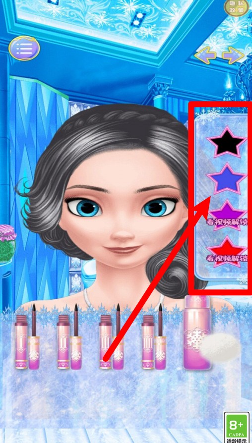 2.右侧星星按钮可以切换美妆主题,尝试不同颜色和妆效,自由发挥你的化妆创意。
