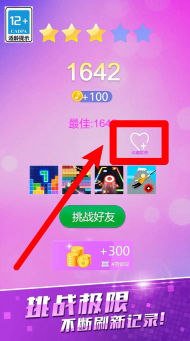 3.点击爱心图标可收藏喜欢的歌曲和关卡,打造属于你的专属音乐曲库。