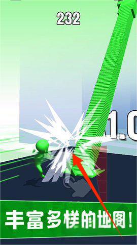 1、操控角色在赛道上前进,利用丰富多样的地图,冲破绿色长条障碍获取分数。