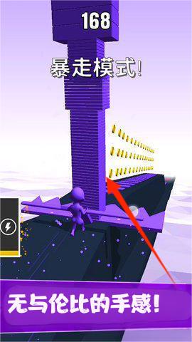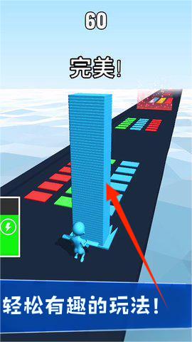 2、收集砖块叠高冲刺:将其堆叠在小人前方形成高塔,堆叠高度影响终点奖励,需合理规划收集路线,平衡奔跑速度与堆叠稳定性,在冲刺过程中打造最高砖块塔。