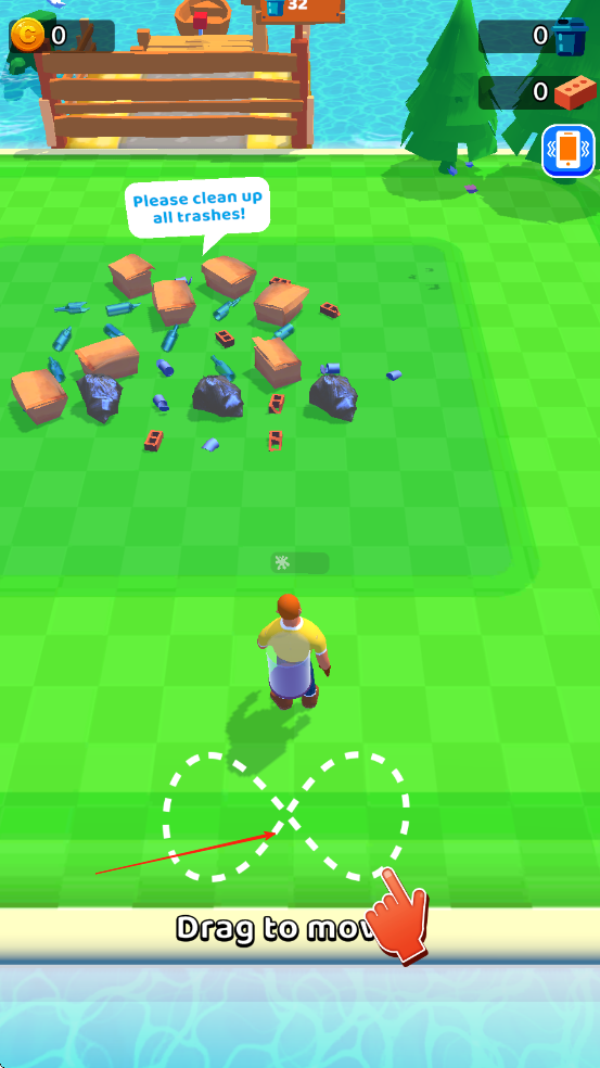 1、进入游戏后从初始沙滩区域开始,滑动屏幕操控角色拾取塑料瓶、纸箱等垃圾,拖入对应分类垃圾桶,积累基础清洁积分与金币。
