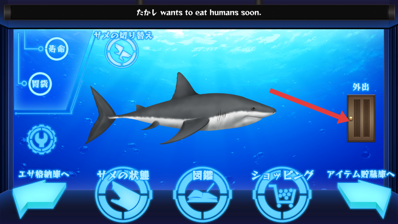 1、在鲨鱼界面点击右侧【外出】按钮,让鲨鱼离开当前场景,进入外部环境开始游戏进程。