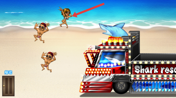 3、在海滩场景中,操控鲨鱼救援车,捕捉或救援红色箭头指向的人物(如比基尼女性角色),完成游戏任务目标。