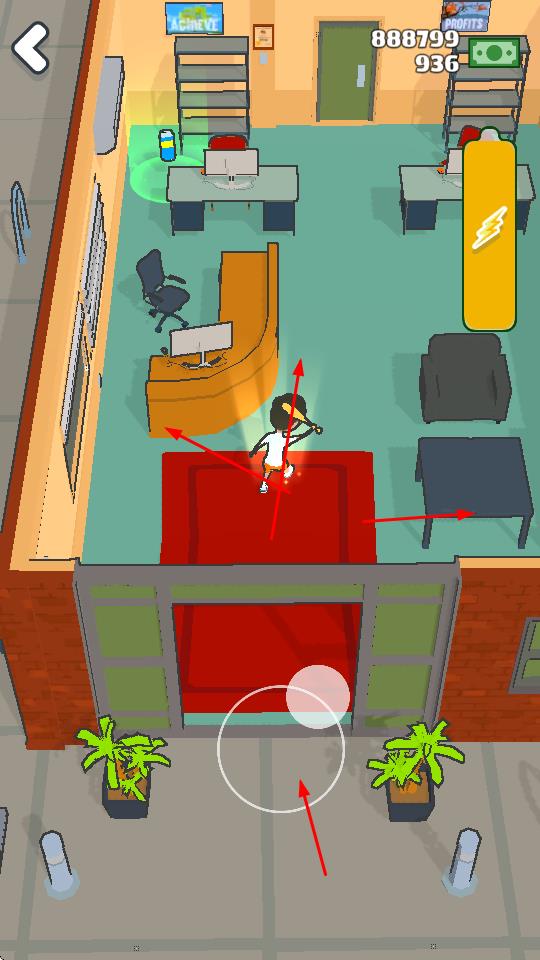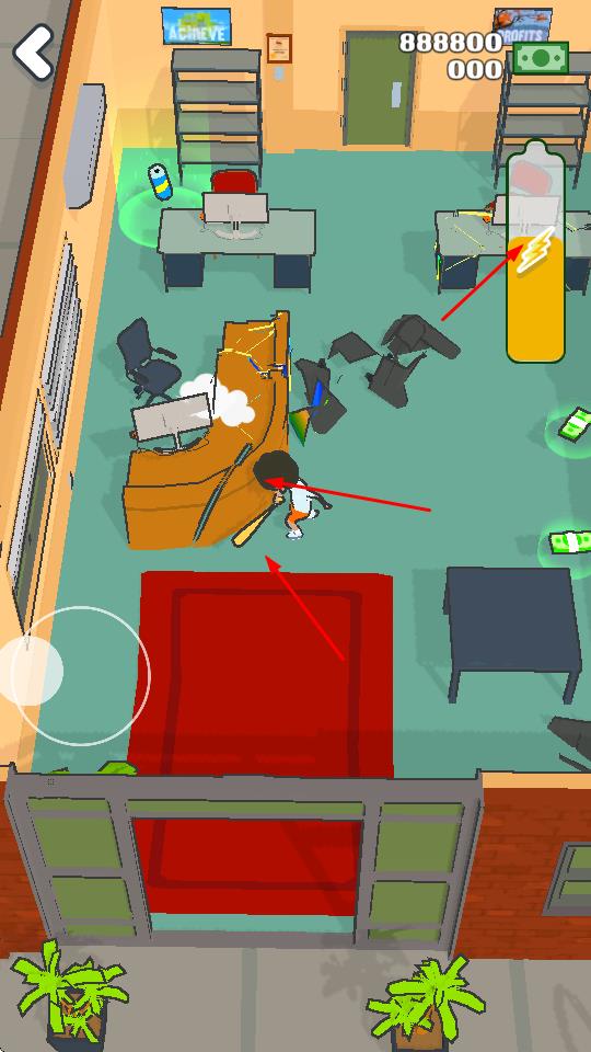 3、玩家操控角色使用球棒破坏场景中的家具等物品,可能会获得金币等奖励,推动游戏进程。