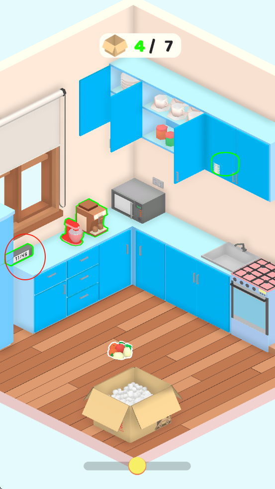 1、进入关卡后,点击纸箱取出待整理物品,观察物品形状、用途,如看到盘子则前往厨房区域,寻找橱柜空位点击放置。
